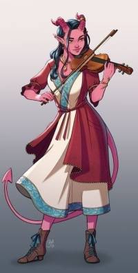 Тифлинг-бард, жена Деллы Алдер, работает в таверне «Плащ путешественника».